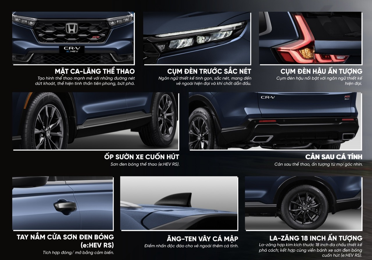 Honda CR-V hoàn toàn mới có kích thước lớn hơn phiên bản trước ở cả chiều dài và rộng. Thêm vào đó, tầm nhìn phía sau được mở rộng nhờ thiết kế khéo léo các trụ kính chắn gió và điều chỉnh vị trí gắn gương chiếu hậu, vừa giúp người lái quan sát thuận tiện hơn. Ngoại hình thể thao cực kỳ bắt mắt của CR-V thu hút người nhìn bởi: Cản trước được thiết kế theo phong cách mắt lưới tổ ong cùng những đường cắt chrom cứng cáp, sơn đen giúp mang lại vẻ bề ngoài đầy mạnh mẽ và thời thượng. Kết hợp cùng đó là cụm đèn LED thanh mảnh và sắc sảo tạo nên một vẻ bề ngoài đầy lịch lãm, bí ẩn. Đường gân sắc nét chạy dọc thân xe từ cụm đèn hậu đến đèn pha tạo cảm giác xe đang chuyển động liên tục về phía trước. Cụm đèn hậu phía đuôi xe thiết kế theo hướng thiết kế dạng dọc truyền thống nhưng nổi bật với hiển thị hiện đại, tinh tế mang lại cảm giác cá tính, ấn tượng. Khoảng sáng gầm xe thông thoáng cùng mâm xe bằng hợp kim đúc cứng cáp với kích thước 18 inch càng làm tôn lên vẽ mạnh mẽ cũng như càng làm tôn lên kiểu dáng đậm chất thể thao vốn có của dòng xe Honda.