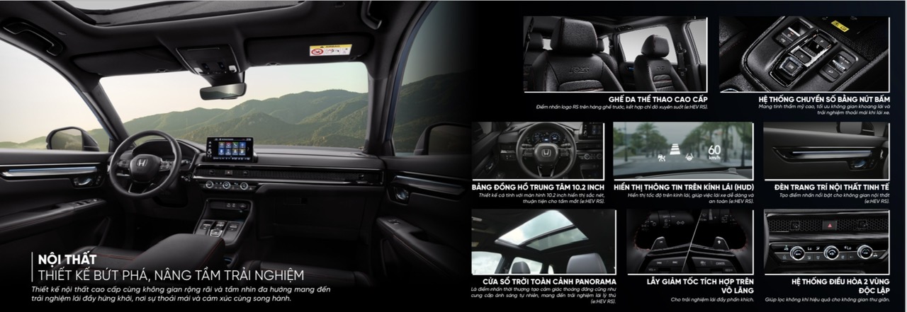 Đi kèm là nhiều trang bị tiện nghi gồm: Cửa sổ trời toàn cảnh (phiên bản L AWD, e:HEV RS), màn hình hiển thị kính chắn gió HUD hiện đại (phiên bản L AWD, e:HEV RS), sạc điện thoại không dây, ghế chỉnh điện 8 hướng cùng tính năng nhớ 2 vị trí cho ghế lái, ghế chỉnh điện 4 hướng cho hành khách.