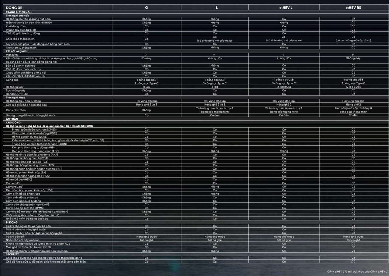 Ngày 02 tháng 02 năm 2026. Honda Việt Nam giới thiệu Honda CR-V thế hệ thứ 6 hoàn toàn mới. Lần đầu tiên Honda Việt Nam ra mắt dòng xe Hybrid bằng mẫu CR-V e:HEV RS Hybrid thân thiện môi trường. Honda CR-V thế hệ thứ 6 chính thức được ra mắt tại thị trường Việt Nam . Trong đó Honda CR-V máy xăng 7 chỗ ngồi (G, L, L AWD) sẽ tiếp tục lắp ráp trong nước. Trong khi phiên bản CR-V e:HEV 5 chỗ ngồi sẽ được bổ sung thêm phiên bản Hybrid – e:HEV L với những thay đổi đáng giá dành cho khách hàng. . Honda CR-V mới gồm 4 phiên bản và 7 tùy chọn màu sắc.
